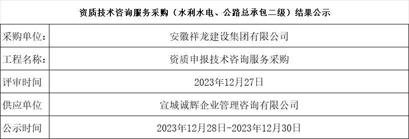 資質(zhì)技術(shù)咨詢服務(wù)采購(水利水電、公路總承包二級)結(jié)果公示