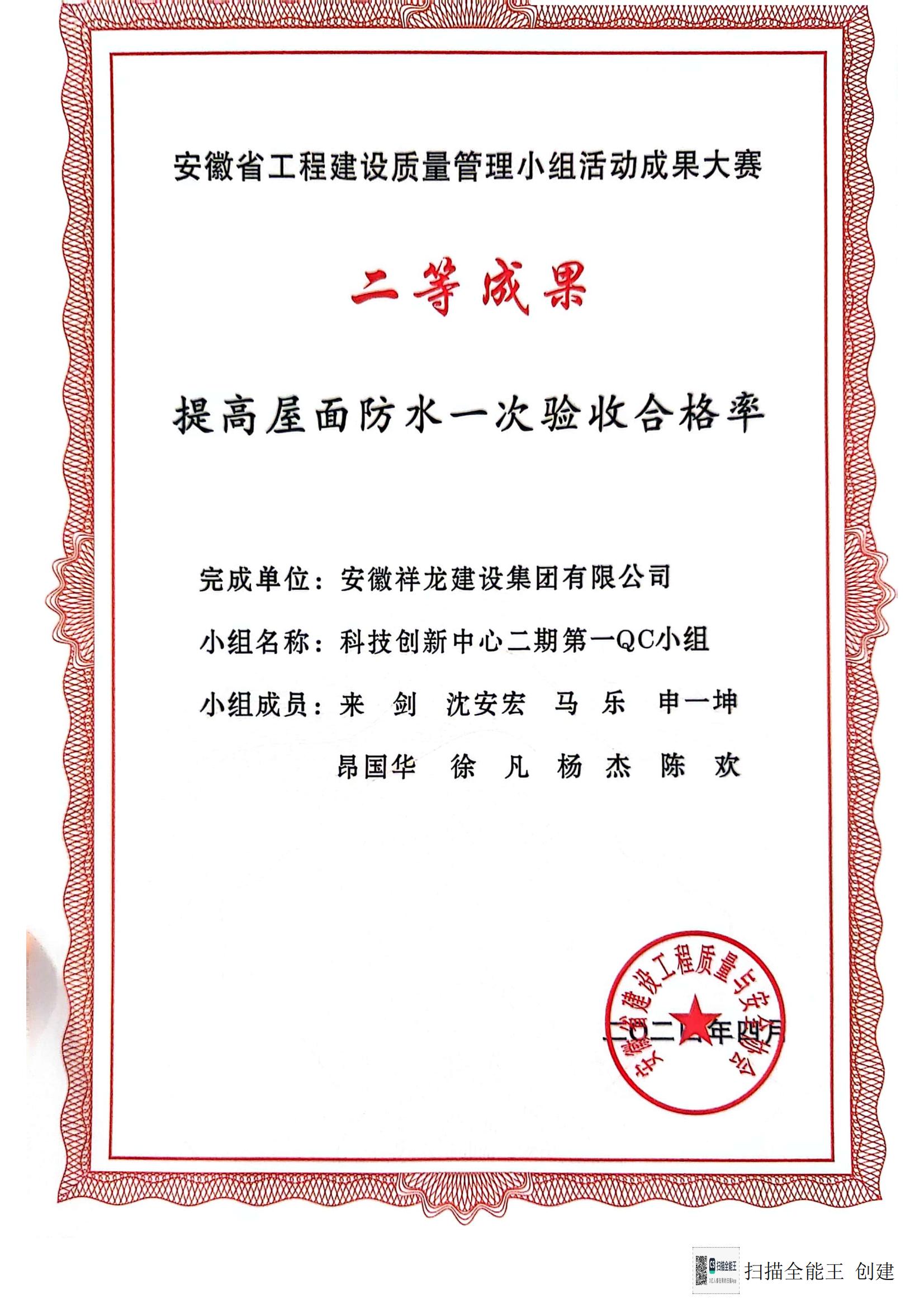 安徽省工程質量管理小組大賽二等成果