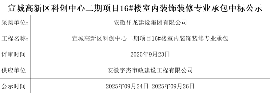 宣城高新區科創中心二期項目16#樓室內裝飾裝修專業承包中標公示